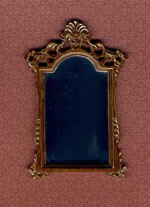Ornate Dollhouse Miniature Walnut Embossed Mantle Mirror in Victorian style is entirely handcarved out of walnut and embellished with 18 k gold paint. The mirror is real mirror and the backing is made of felt. This heirloom miniature is absolutely exquisite!!!!